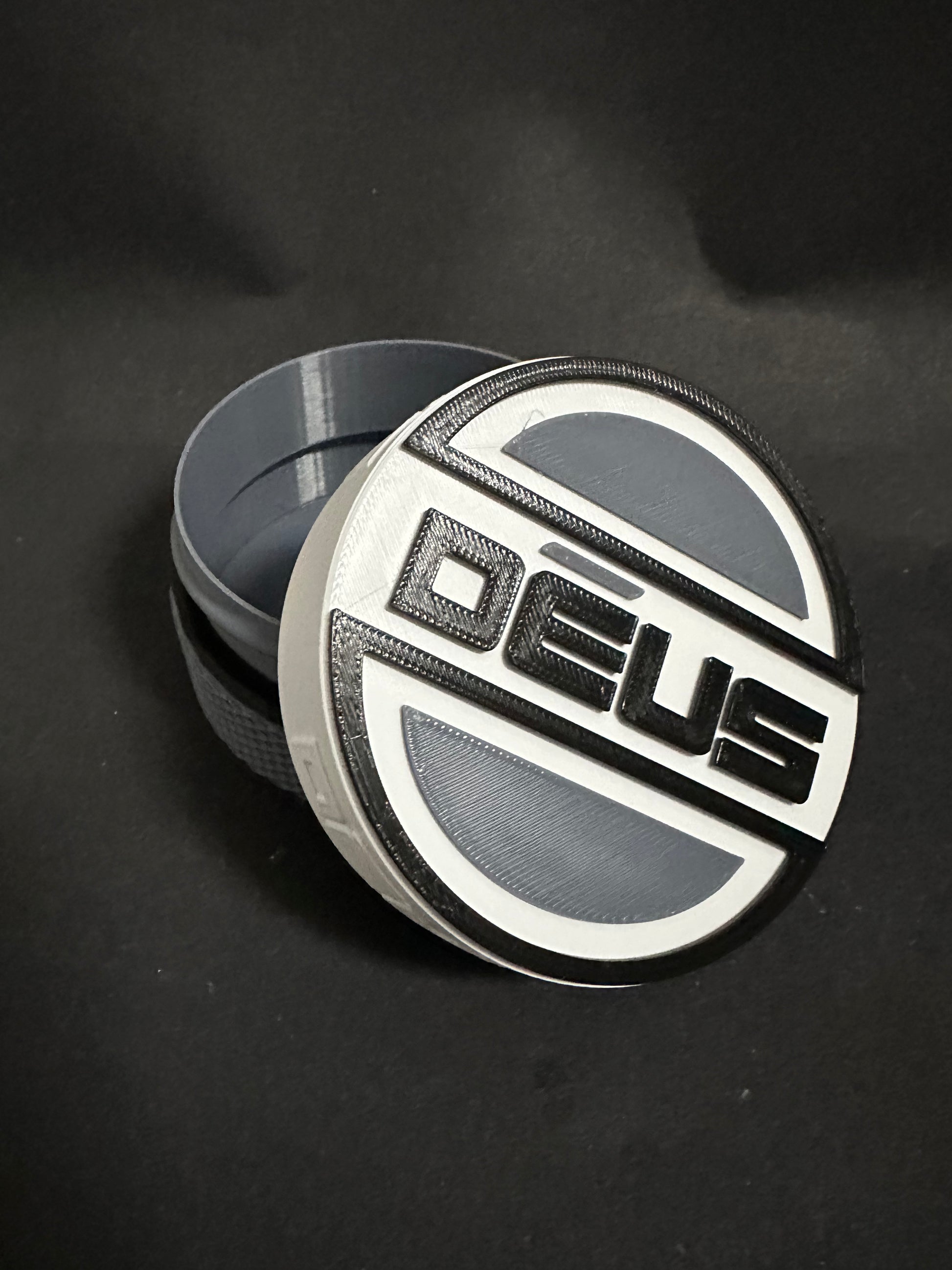 Deus I coin case with a cross cross design on the bottom half and “DEUS” around the top half.