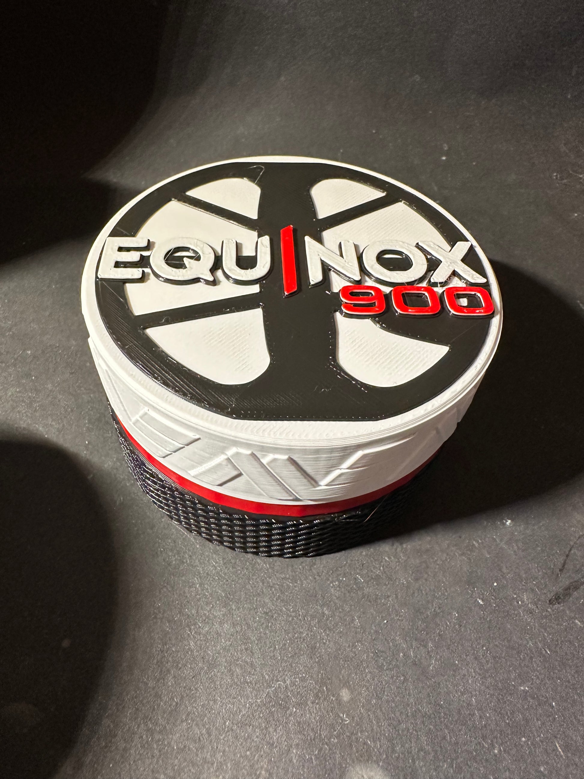 Equinox coin case with a cross cross design on the bottom half and Minelab logos around the top half.