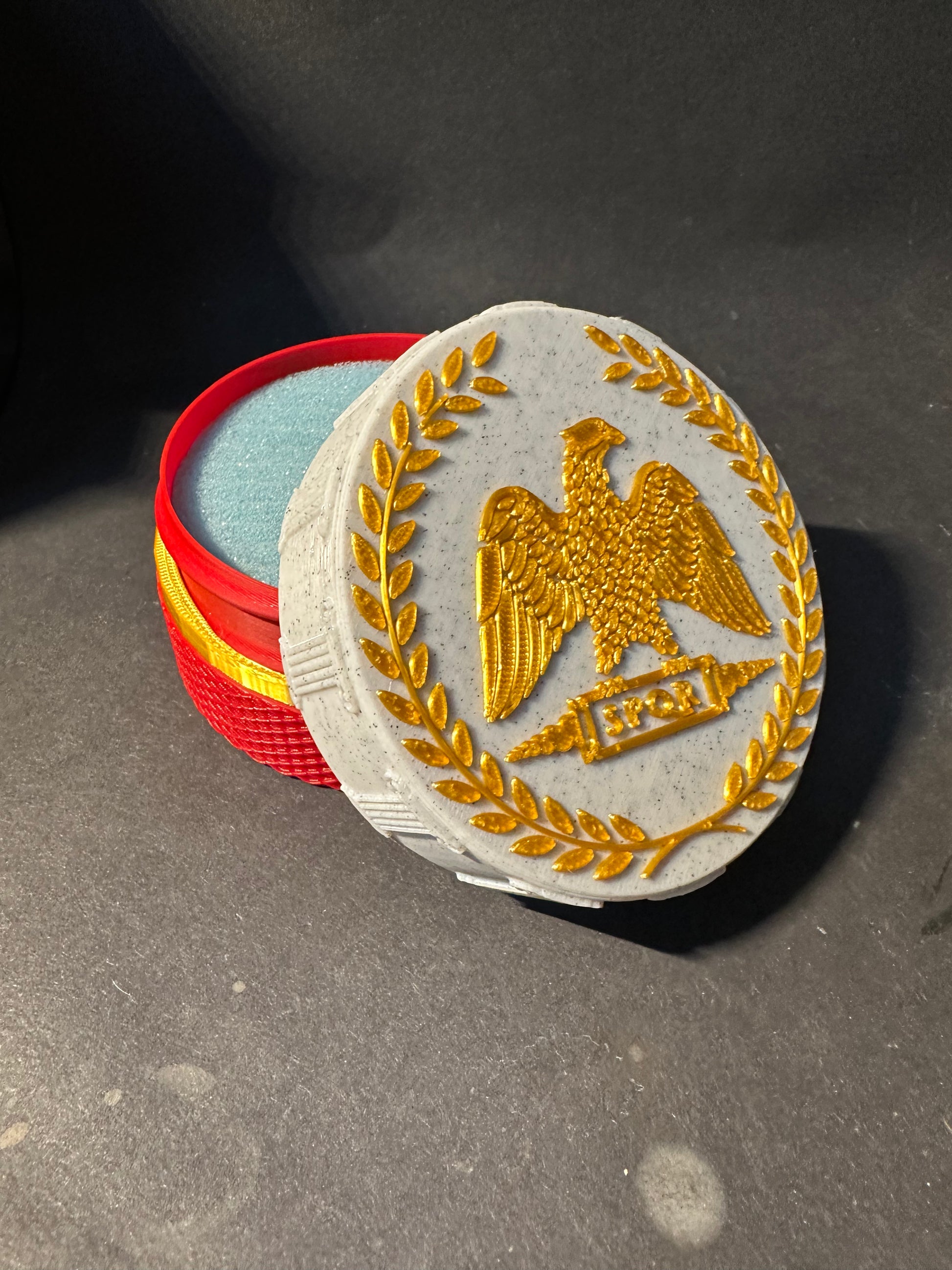 Roman coin case with a criss cross design on the bottom half and a marble effect top with Roman pillars around the edge.