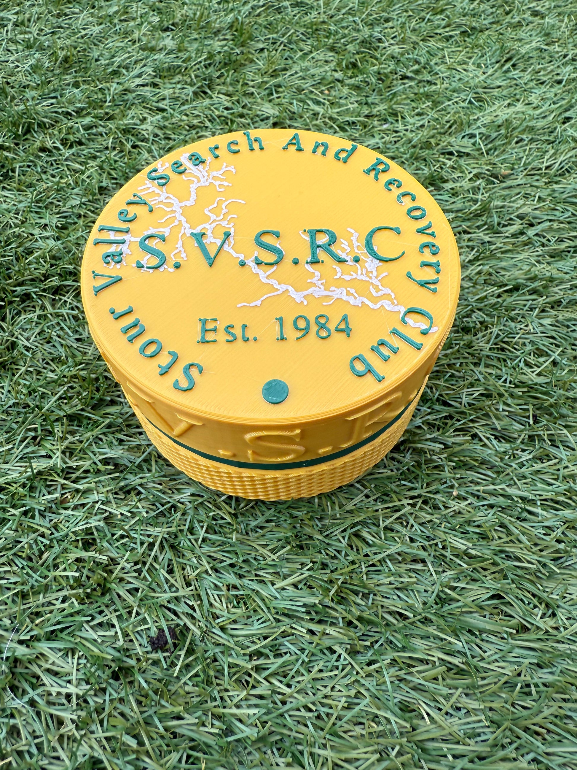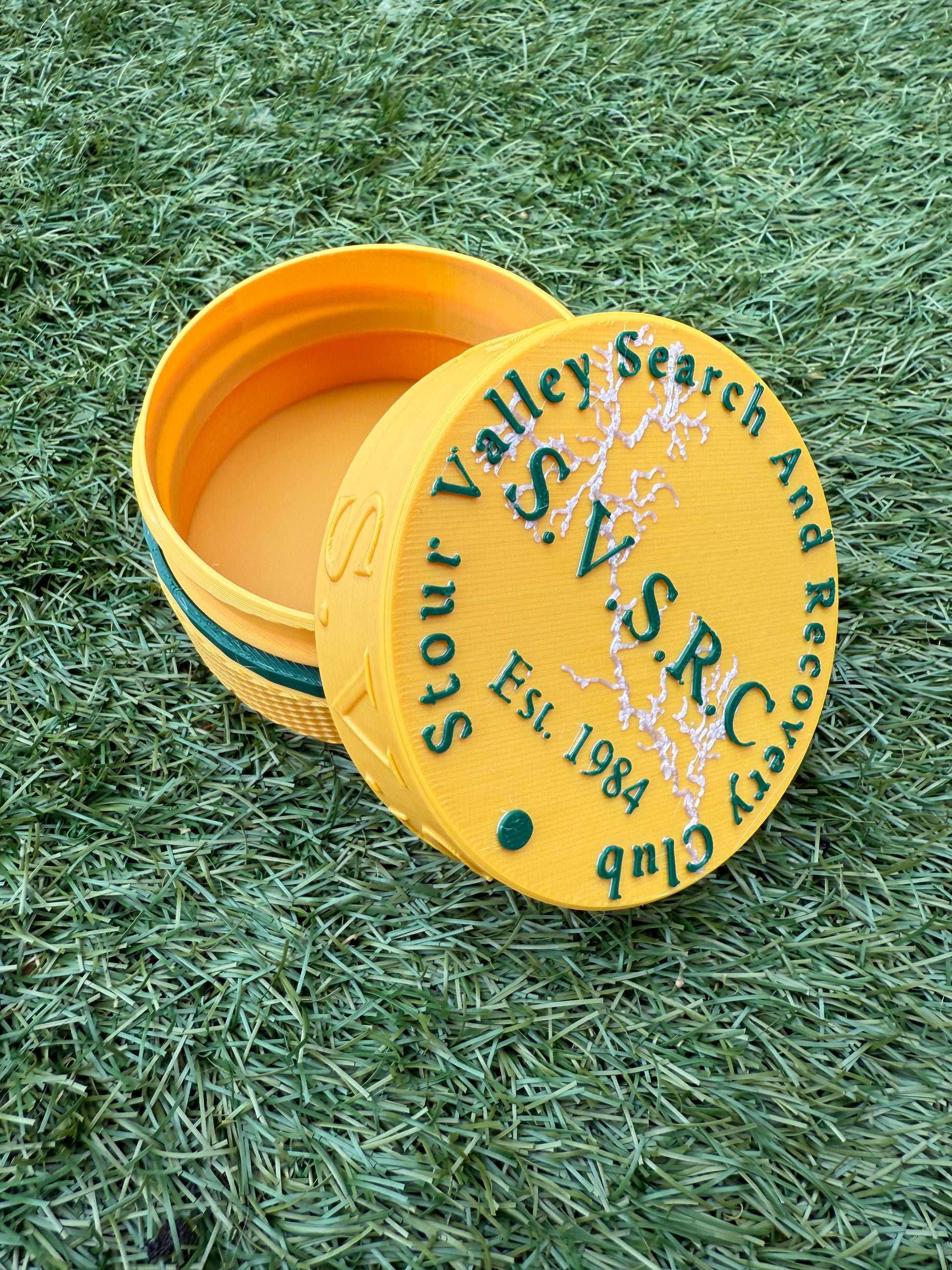 SVSRC coin case with a cross cross design on the bottom half.