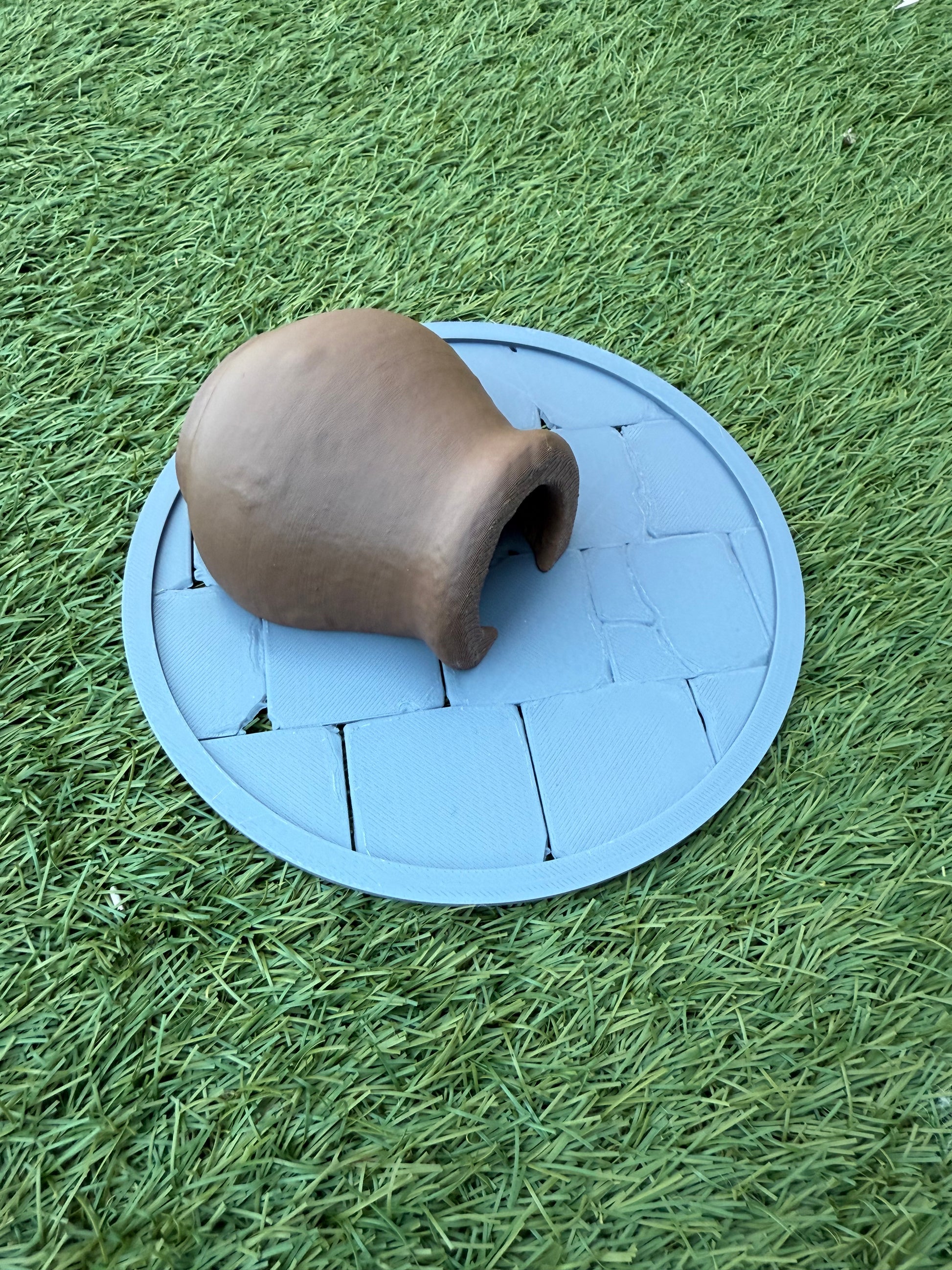 A Tudor pot laying on a slab floor tray to depict a broken pot on the floor.
