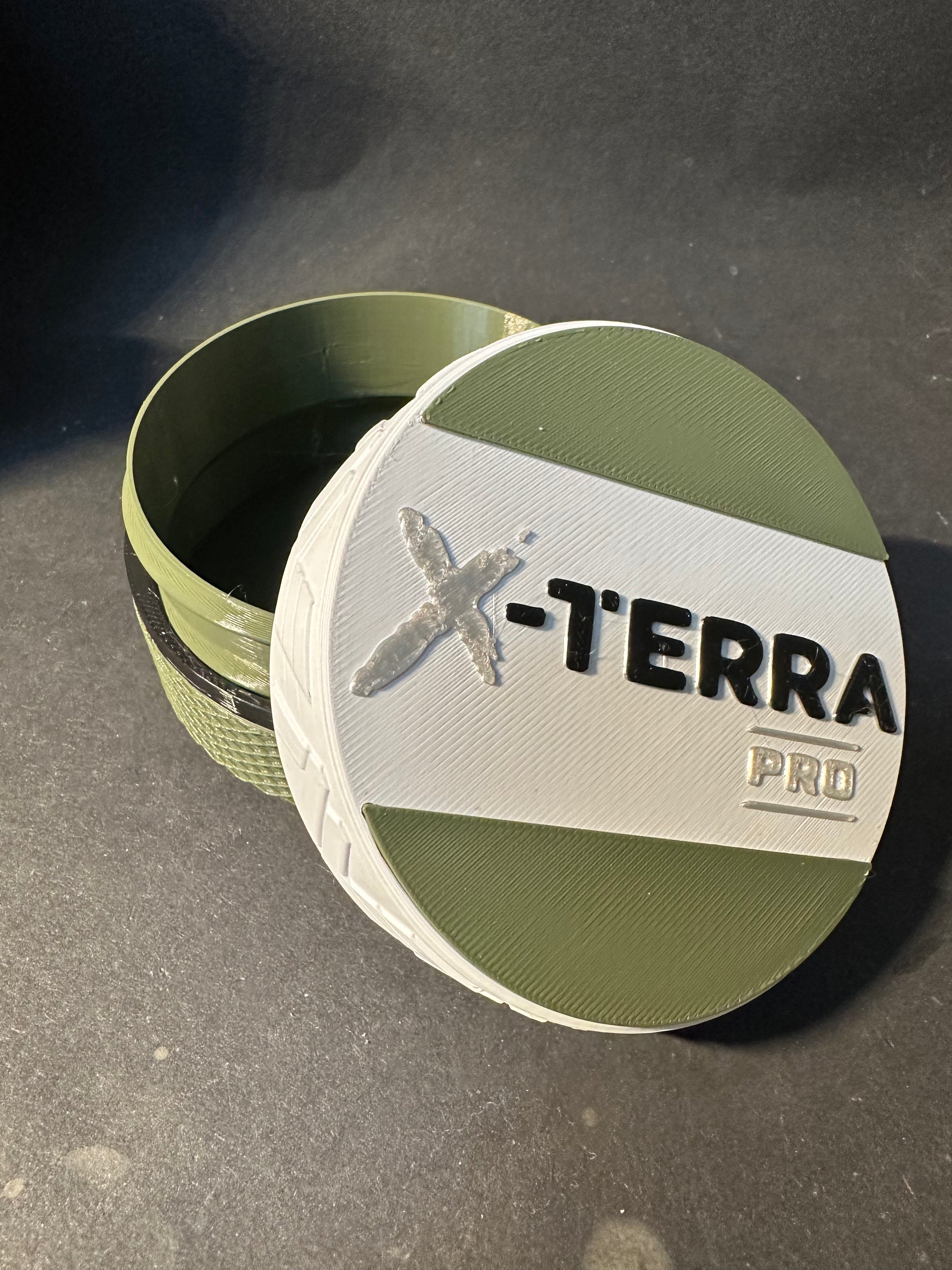 X-terra coin case with a cross cross design on the bottom half and the Minelab logo around the top half.